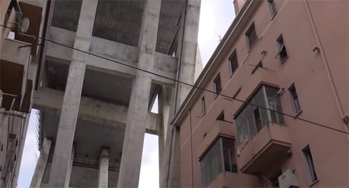 Vi mostriamo una sequenza di foto che dimostrano come i pilastri di tronconi del ponte siano appoggiati sui palazzi sottostanti, quelli evacuati: