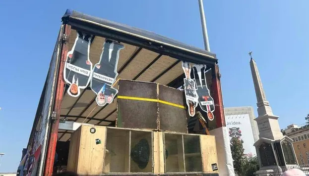 Su un carro del Pride di Roma sono state appese quattro sagome a testa in giù, raffiguranti Donald Trump, J.K. Rowling, Bejamin Netanyahu ed Elon Musk. È il camion, tra i 40 che stanno sfilando nella Capitale per la parata arcobaleno, da cui sventolano più bandiere palestinesi. Accanto una ragazza tiene un cartello con su scritto: "Amore libero come la Palestina".