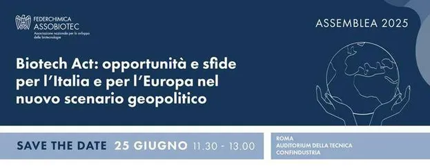 In occasione della sua Assemblea annuale, Assobiotec-Federchimica organizza il convegno pubblico: “Biotech Act: opportunità e sfide per l’Italia e per l’Europa nel nuovo scenario geopolitico” per domani, Mercoledì 25 giugno 2025, dalle ore 11.30 alle 13.00, all'Auditorium della Tecnica – Confindustria, Roma. L’evento sarà un momento di confronto ad alto livello sul ruolo strategico delle biotecnologie in Europa e in Italia, tra competitività, autonomia tecnologica e geopolitica.
