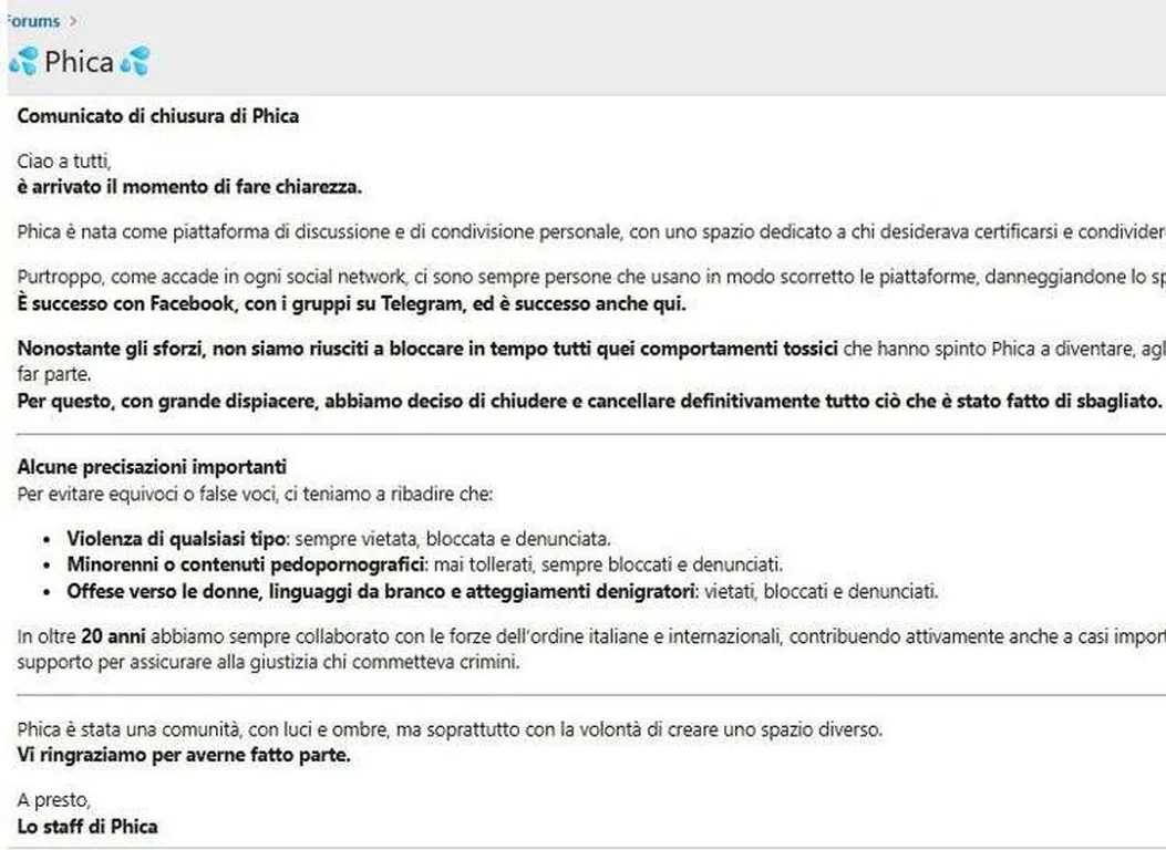 ''Alcune precisazioni importanti Per evitare equivoci o false voci, ci teniamo a ribadire che: Violenza di qualsiasi tipo: sempre vietata, bloccata e denunciata. Minorenni o contenuti pedopornografici: mai tollerati, sempre bloccati e denunciati. Offese verso le donne, linguaggi da branco e atteggiamenti denigratori: vietati, bloccati e denunciati. In oltre 20 anni abbiamo sempre collaborato con le forze dell’ordine italiane e internazionali, contribuendo attivamente anche a casi importanti (come quello seguito dal giudice Cantone), fornendo ogni volta dati e supporto per assicurare alla giustizia chi commetteva crimini. Phica è stata una comunità, con luci e ombre, ma soprattutto con la volontà di creare uno spazio diverso. Vi ringraziamo per averne fatto parte''.