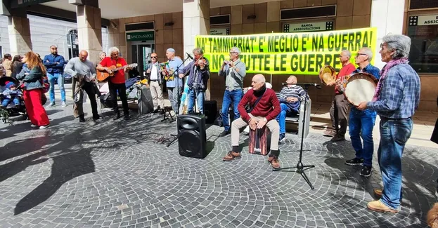 “Quelli della Curva” al corso Umberto I, davanti a intesa San Paolo di Torre Annunziata, per la loro iniziativa contro tutte le guerre.