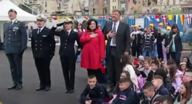 Alla cerimonia dell’alzabandiera tutti i presenti hanno intonato l’inno di Mameli.