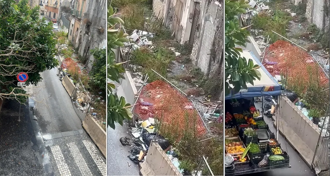 Da allora, però, la situazione è precipitata: l’area transennata è diventata una discarica a cielo aperto, invasa da rifiuti di ogni genere, carcasse animali e vegetazione incolta. Una scena indegna, con grave rischio igienico-sanitario, soprattutto perché il tratto si trova in pieno centro urbano, tra abitazioni civili e strade trafficate da pedoni e auto (Nella foto si nota un furgone di frutta transitare proprio accanto ai cumuli di immondizia).