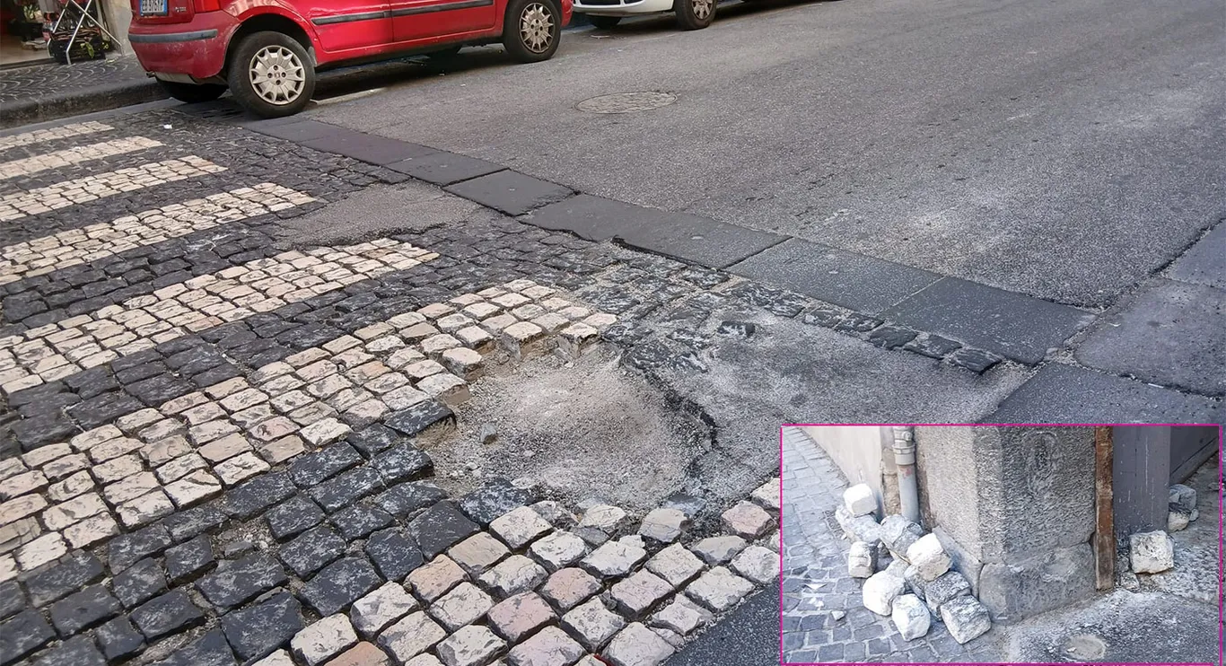 Continuano a moltiplicarsi sui social le segnalazioni dei cittadini sullo stato di dissesto delle strade cittadine. L’ultima denuncia riguarda corso Umberto I, all’altezza del civico 172, dove l’attraversamento pedonale versa in condizioni precarie: tozzetti di porfido saltati che rendono difficile e pericoloso il passaggio, non solo per i pedoni ma anche per motociclisti e automobilisti.
