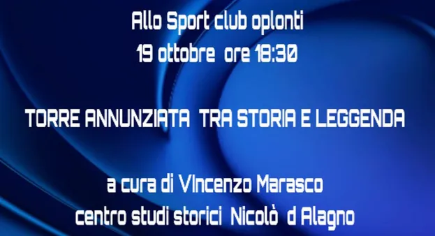 Lo Sport Club Oplonti ospiterà domenica 19 ottobre 2025, alle ore 18.30, l’evento culturale “Torre Annunziata tra storia e leggenda”. Sarà Vincenzo Marasco, presidente del Centro Studi Storici Nicolò D’Alagno”, a raccontare la storia locale spaziando dalla fondazione della città fino agli inizi del ‘900.