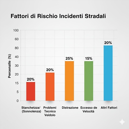 Circa il 20% degli incidenti stradali in Italia è attribuibile a stanchezza e sonnolenza alla guida. Combinando questo dato con i problemi tecnici del veicolo (20-25% degli incidenti), emerge che quasi il 40-45% degli incidenti è legato a questi due fattori. Per ridurre il rischio è fondamentale fare pause regolari, mantenere una postura corretta al volante e verificare periodicamente lo stato degli ammortizzatori e degli altri componenti del veicolo