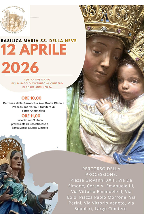 A distanza di 120 anni, don Paolino Franzese, parroco e rettore della Parrocchia di Ave Gratia Plena, Basilica Pontificia di Maria SS. della Neve, invita i fedeli a prendere parte alla solenne processione che si terrà alle ore 10.00 di domenica 12 aprile, dalla Basilica al cimitero cittadino.