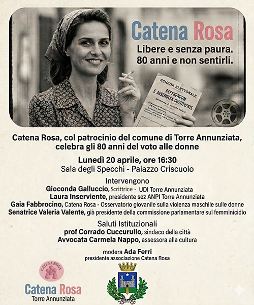 “Catena Rosa” celebra l’ottantesimo anniversario del riconoscimento del diritto di voto alle donne in Italia. L’associazione di Torre Annunziata, presieduta da Ada Ferri, promuove “Libere e senza paura. 80 anni e non sentirli”, un incontro che nasce con l’obiettivo di raccontare il valore di una conquista che non può essere data per scontata, riportando l’attenzione sull’importanza della partecipazione e sul rischio di arretramento dei diritti, soprattutto in un’epoca segnata da forte astensionismo e disaffezione civica.