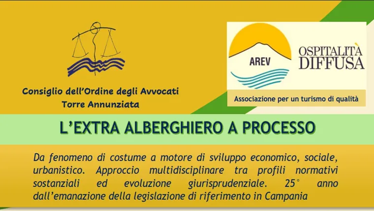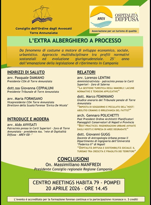 A venticinque anni dalla promulgazione di due leggi regionali fondamentali per il settore turistico campano, si apre un momento di riflessione sul presente e sul futuro dell’ospitalità extra-alberghiera. La rete “Ospitalità Diffusa – AreV-OD”, presieduta dall'avvocato Aldo Avvisati, ha promosso, insieme al Consiglio dell’Ordine degli Avvocati di Torre Annunziata, un convegno dedicato all’analisi dell’evoluzione normativa e degli effetti prodotti sul territorio il giorno 20 aprile presso il Centro Meetings Habita Pompei 79 alle ore 14,45.