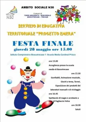 Giovedì 28 maggio, alle ore 15, presso l'Istituto Comprensivo Boscotrecase 1 - Scuola media Cardinal Prisco, si terrà la manifestazione conclusiva con la partecipazione dei giovani che partecipano al progetto di reinserimento sociale. Ci saranno gonfiabili, animazione musicale, giochu, tornei e l'esposizione di prodotti realizzati dai laboratori manuali e di riciclaggio.