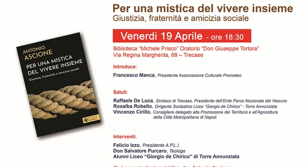 Venerdì 19 aprile 2024 alle ore 18,30 a Trecase in Via Regina Margherita n.68 nella biblioteca “Michele Prisco” dell’oratorio “don Giuseppe Tortora” del Santuario Diocesano “S. Maria delle Grazie e San Gennaro” retto da don Antonio Ascione, si tiene la presentazione del libro “Per una mistica del vivere insieme” Giustizia, Fraternità e Amicizia sociale - Editrice EFFATÀ 2022.