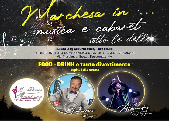 Si terrà sabato 15 giugno alle 20,00 l’evento “Marchesa in... musica e cabaret sotto le stelle” patrocinato dall’amministrazione comunale di Boscoreale e inserito nel cartellone di eventi della Città Metropolitana di Napoli. All’interno dell’Istituto Comprensivo Statale 3° Castaldi Rodari di via Marchesa l’iniziativa che mette insieme degustazioni, musica e divertimento.