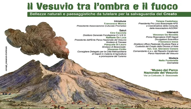 Le bellezze naturali e paesaggistiche da tutelare per la salvaguardia del Creato. Dopo l’introduzione di Francesco Manca, Presidente Associazione Culturale Prometeo e i saluti istituzionali di Ciro Cacciola, Direttore Generale Fondazione C.I.V.E.S.; Raffaele De Luca, Presidente dell'Ente Parco Nazionale del Vesuvio, Sindaco di Trecase; Pasquale Di Lauro, Sindaco di Boscoreale; Vincenzo Cirillo, Consigliere Delegato per la Città Metropolitana di Napoli in materia di Agricoltura e promozione del Turismo, Tiziana Castellano, Presidente Pro Loco Boscoreale APS e Coordinatrice della Consulta delle Associazioni AGORÀ, seguono gli interventi di Vincenzo De Novellis, Primo Ricercatore CNR Napoli, Divulgatore Scientifico; Francesco Iossa, Direttore Ufficio Pastorale Giustizia Pace e del Custodia del Creato della Diocesi di Nola; Ten. Col. Giovanni Cenere, Comandante in s.v. del Reparto Carabinieri Parco Nazionale del Vesuvio. Modera: Nello Fontanella, Giornalista.