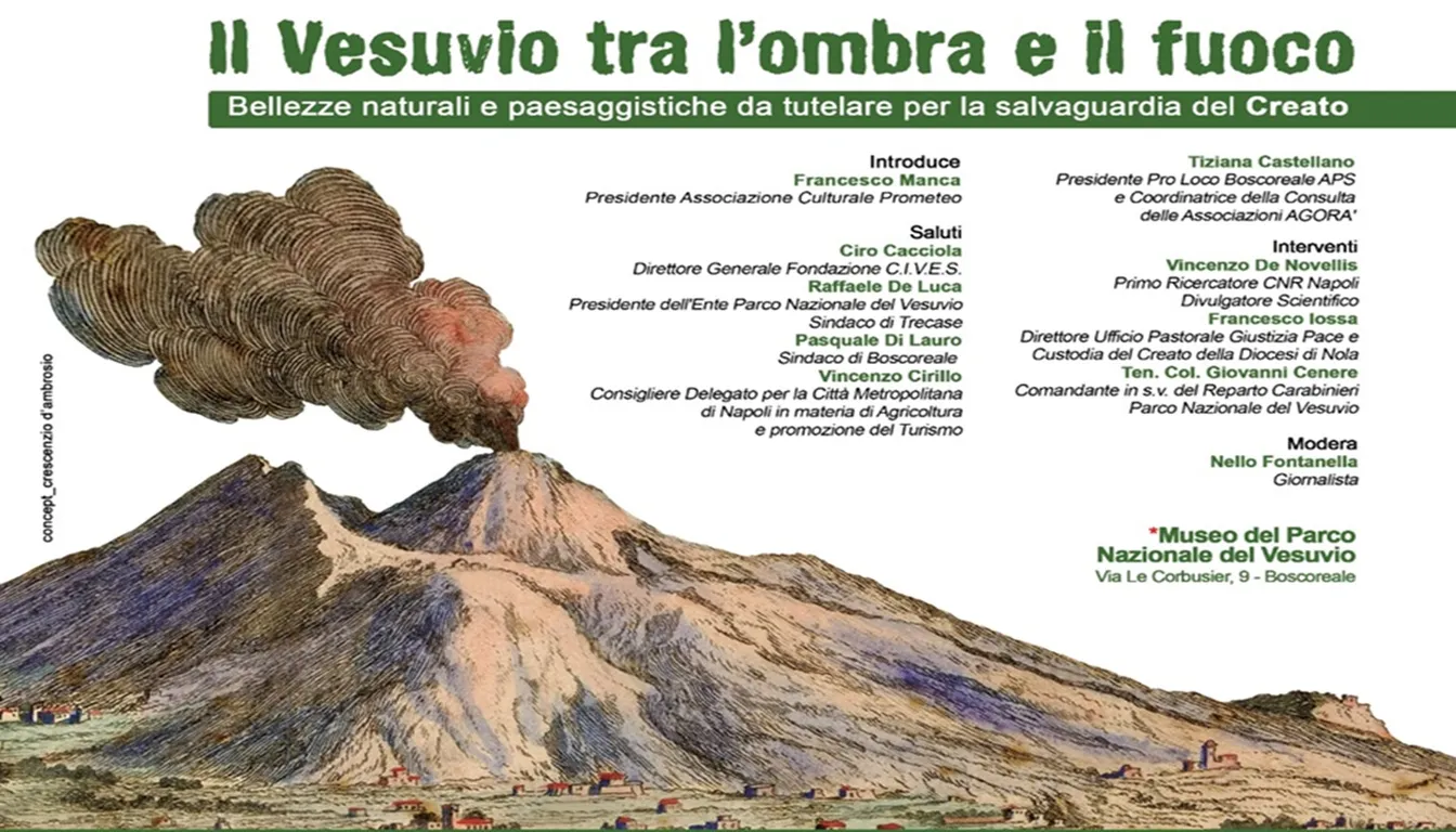 L’Associazione Prometeo, che da oltre trenta anni opera nel territorio vesuviano attraverso iniziative finalizzate a diffondere la cultura, il recupero della “memoria storica”, la promozione di azioni tese alla riscoperta del territorio e alla rivalutazione storico-culturale dell’area vesuviana, in occasione dei 30 anni dell’istituzione del Parco Nazionale del Vesuvio, i 10 anni dell’Enciclica “Laudato Si’” e gli 800 anni dalla composizione del “Cantico delle Creature” di San Francesco d’Assisi, in collaborazione con la Fondazione C.I.V.E.S., il Museo del Parco Nazionale del Vesuvio, l’Ente Parco Nazionale del Vesuvio, il Comune di Boscoreale, la Pro Loco di Boscoreale APS, la Consulta delle Associazioni AGORÀ, il Liceo Artistico e delle Scienze Umane “Giorgio de Chirico” Torre Annunziata, e con il Patrocinio morale dell’Ordine dei Giornalisti Campania e dell’UCSI (Unione Cattolica Stampa Italiana) Campania, venerdì 20 giugno 2025 alle ore 18,30 a Boscoreale, nel Museo del Parco Nazionale del Vesuvio in via Le Corbusier n.9, organizzano il convegno “Il Vesuvio tra l’Ombra e il Fuoco”.