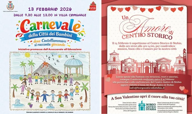 Castellammare di Stabia si prepara a celebrare San Valentino e il Carnevale con un fine settimana ricco di appuntamenti tra il Centro Antico e la Villa Comunale. Da venerdì 13 a domenica 15 febbraio 2026 la città ospiterà eventi dedicati a bambini, famiglie e visitatori, con attività educative, momenti di animazione e iniziative legate alle tradizioni locali.