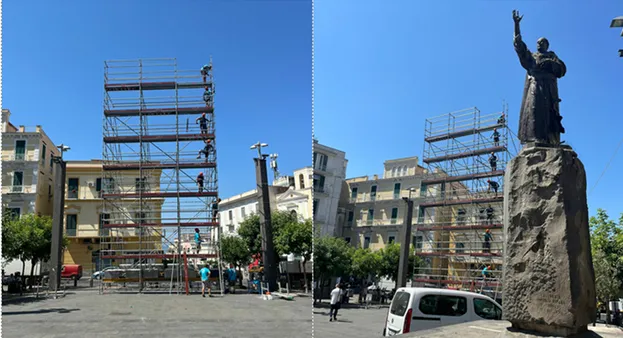 Festa dei Quattro Altari: dopo Palazzo Baronale e corso Umberto, stamattina – lunedì 15 luglio – è stata completata anche l’impalcatura che servirà a sostenere l’altare di piazza Santa Croce. Una novità assoluta per la festa 2.0 che ritorna dopo 15 anni di stop: è infatti la prima volta che viene utilizzato lo spazio antistante la basilica pontificia di Torre del Greco per ospitare una struttura scenografica.