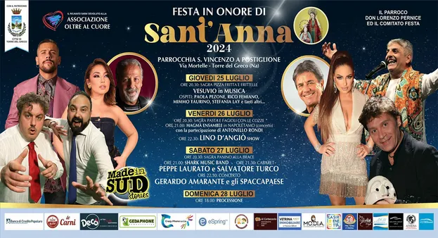 L'aria di festa contagia Torre del Greco. E dopo i Quattro Altari si sposta nella zona della Litoranea. Merito della parrocchia di San Vincenzo a Postiglione, che da mercoledì 24 a domenica 28 luglio dedica una serie di eventi religiosi e ludici a Sant'Anna, momenti che culmineranno con l'attesa processione e l'immancabile spettacolo di fuochi pirotecnici.