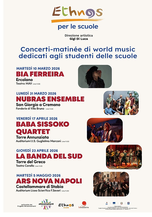 Prende il via, il 10 marzo, Ethnos per le Scuole, cofinanziato dall’assessorato alle politiche sociali della Regione Campania ed inserito nel progetto Attraversamenti, organizzato da Ethnos Club APS e da La Bazzarra in collaborazione con una rete associativa. Attraverso laboratori musicali, incontri con musicisti professionisti di livello nazionale e internazionale e la partecipazione a concerti, si offrirà, fino a maggio, una importante opportunità di esperienza e arricchimento agli studenti di Torre del Greco, Portici, Ercolano, San Giorgio a Cremano, Torre Annunziata e Castellammare di Stabia. Ideato per gli alunni delle scuole primarie e secondarie, il progetto prevede un ciclo di concerti di musiche del mondo: ogni incontro è concepito come un’esperienza educativa completa. Accanto alla performance musicale dal vivo, che consente agli alunni di entrare in contatto diretto con tradizioni sonore provenienti da diversi contesti culturali, è previsto un momento di dialogo e approfondimento con gli artisti.