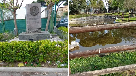 E veniamo al parco Palatucci: la vasta area dedicata al giovane questore-eroe di Fiume è ridotta a un polverone che, con l’approssimarsi dell’estate, sarà ancora più intenso. La pavimentazione in terra battuta, avendo perso del tutto le griglie salvaprato, è in evidente stato di dissesto e degrado, finanche nei pressi della casa dell’acqua imbrattata da graffiti e atti vandalici. Il bel monumento all’ingresso del parco, con al centro il volto del “giusto tra le nazioni”, rimane giorno e notte circondato da auto in perenne sosta selvaggia e da rifiuti. Mai un controllo, né alcuna attività ordinaria di pulizia. Sono perfino scomparse le fioriere poste davanti alla stele.