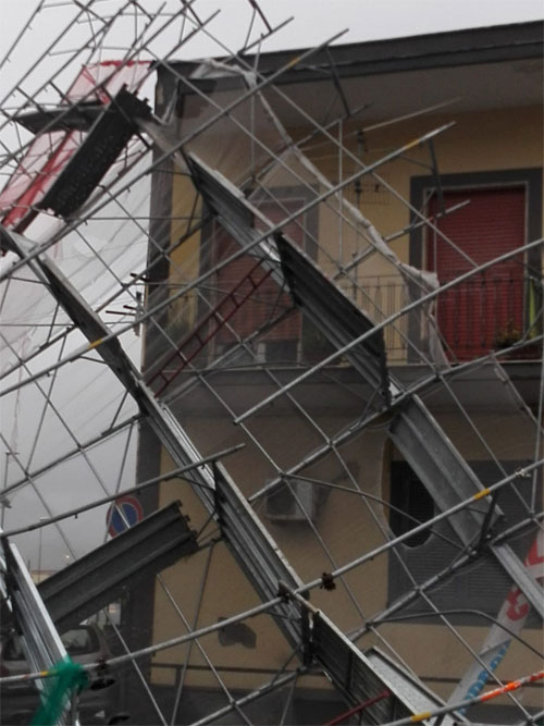 Il forte vento che sta impervesando da ieri su Torre Annunziata ha buttato giù questa mattina un'impalcatura allestita davanti ad un palazzo in ristrutturazione, situato all'inizio di Traversa Andolfi, in prossimità dell'incrocio con via Plinio.
