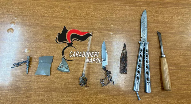 Dopo una violenta colluttazione, il 23enne è stato bloccato. Nella manica della tuta un coltello a farfalla, addosso uno scalpello, una lama senza manico, 2 frammenti di vetro e vari pezzi di ferro arrugginiti e appuntiti.
