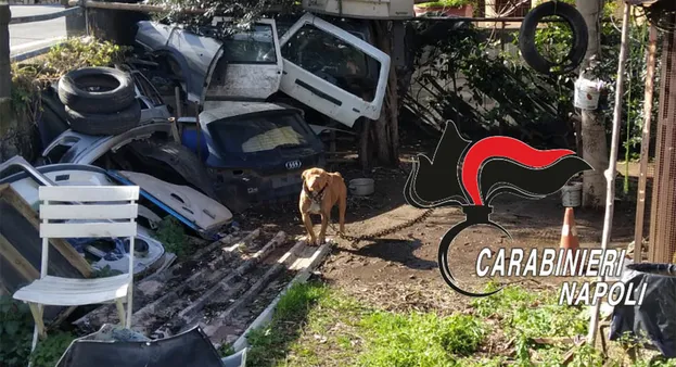 I militari, insieme a personale dell’Asl, hanno controllato un’abitazione e lì hanno trovato un pitbull red nose. Il molosso era in stato di abbandono tra rifiuti e carcasse di auto, legato con una catena all'albero del giardino.