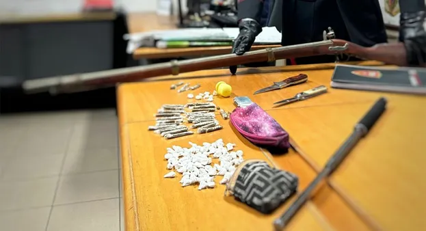 Durante una perquisizione domiciliare, i militari hanno rinvenuto 102 dosi di cocaina, 30 stecchette di hashish e materiale vario per il confezionamento dello stupefacente. Parte della droga era nascosta tra le tegole di una pensilina esterna ad una piccola corte d’accesso.