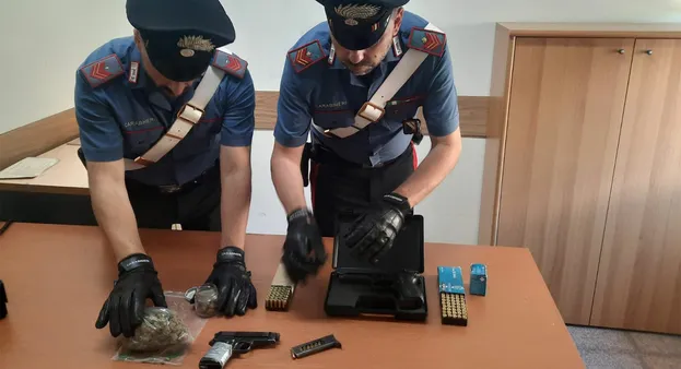 I carabinieri hanno perquisito l’abitazione dell’uomo e lì hanno trovato un ordigno esplosivo artigianale di 180 grammi. La perquisizione però non si è fermata e poco dopo i militari hanno trovato 1 pistola semiautomatica con matricola abrasa e pronta a sparare, nel caricatore 8 proiettili. Sequestrata anche una pistola a gas modello 92 Fs e 50 proiettili 9x19. Trovati colpi anche a salve, 61 per l’esattezza.