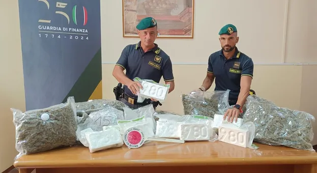 Tale comportamento destava l’attenzione degli investigatori che, attraverso un ordinario controllo di polizia, rinvenivano nel portabagagli del monovolume 10 involucri di marijuana, in due scatole di cartone dal peso circa di circa 110 chilogrammi, e 14 panetti di cocaina, in una valigia da peso 13 chilogrammi.