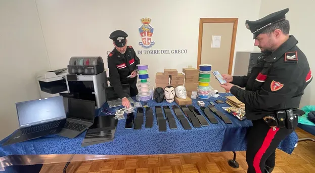 E’ tardo pomeriggio quando i militari della sezione operativa di Torre del Greco avviano una perquisizione in un locale sospetto di via Nazionale. All’interno 59 telefonini, 6 carte prepagate intestate ad altrettante persone, 3 notebook, 6 chiavette usb e una stampante 3D corredata da circa 90 bobine di vario colore.