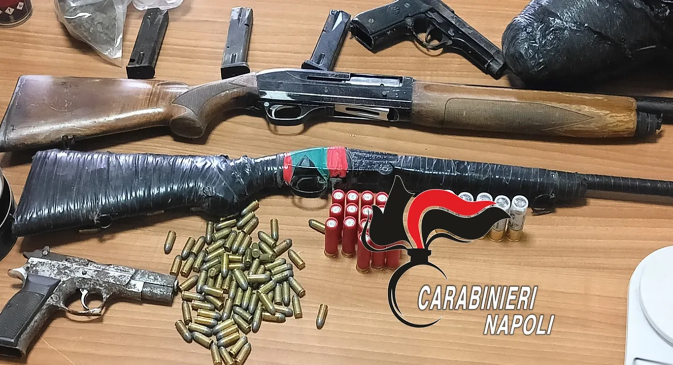 Due pistole con matricola abrasa, due fucili da caccia e 107 munizioni. Insieme alle armi e alle munizioni 3 caricatori e 1 bomboletta spray lubrificante per le armi.