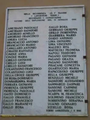 Giovedì 21 gennaio prossimo, alle ore 18.15, nella Basilica dedicata a Maria SS. della Neve, mons. Raffaele Russo celebrerà una messa in suffragio delle vittime dello scoppio. Al termine, sarà posta una corona di alloro da parte dell'Amministrazione comunale ai piedi della lapide, con la benedizione di mons. Russo.