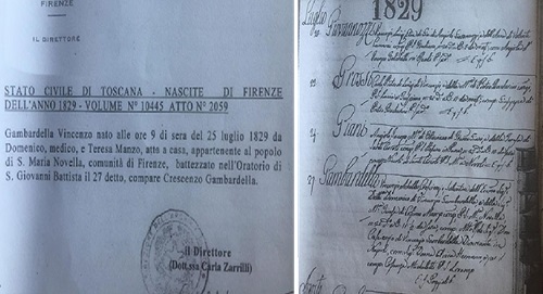 A tal proposito un ringraziamento va alla direttrice dell’Archivio di Stato di Firenze dottoressa Carla Zarrilli e alle dipendenti Andreina Cardiota e Franca Orlandi, il cui aiuto è stato prezioso per la ricerca degli atti. Anche perché nei libri che parlano di Vincenzo Gambardella la sua data di nascita è riportata erroneamente al 15 luglio 1829, cioè a dieci giorni prima.