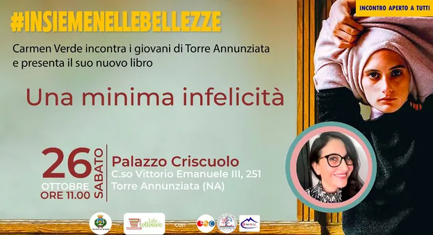 Sarà Palazzo Criscuolo a Torre Annunziata ad ospitare la presentazione del nuovo libro di Carmen Verde “Una minima infelicità”. Alle ore 11.00 di sabato 26 ottobre 2024 la scrittrice incontrerà i giovani del territorio e in particolare gli studenti degli istituti superiori della città. L’evento è il preludio alla terza edizione 2025 della kermesse culturale “Insieme nelle bellezze” promosso dall’associazione “Caffè Letterario Nuovevoci”, in partenariato con il Liceo Statale “Pitagora-Croce”, il Liceo Artistico e delle Scienze Umane “Giorgio de Chirico”, l’Istituto di Istruzione Secondaria “Guglielmo Marconi” e l’Istituto Alberghiero “Augusto Graziani” di Torre Annunziata.