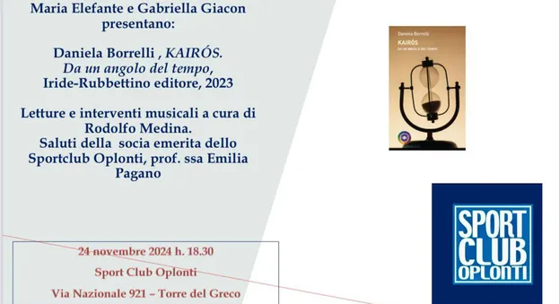 Maria Elefante e Gabriella Giacon presenteranno “Kairos, da un angolo del tempo” di Daniela Borrelli (Iride-Rubbettino editore). Sarà lo Sport Club Oplonti (Via Nazionale 921 – Torre Del Greco) ad ospitare l’evento in programma domenica 24 novembre 2024 alle ore 18.30.