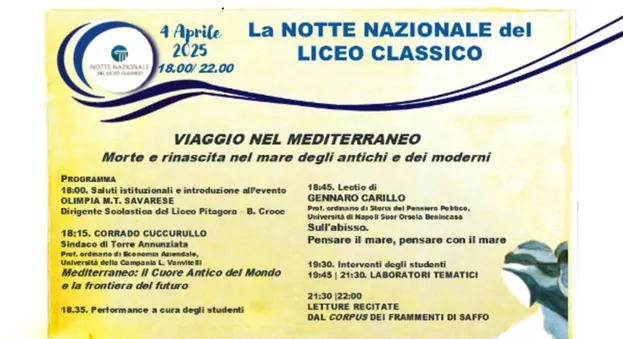 Anche quest'anno il Liceo Pitagora -Croce di Torre Annunziata, diretto dalla prof.ssa Tiziana Savarese, partecipa alla XI edizione della Notte Nazionale del Liceo Classico, dedicata al tema generale del Mediterraneo.