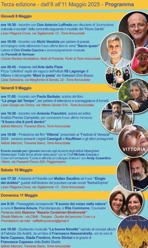La quattro giorni di “Insieme nelle Bellezze” si svolgerà da giovedì 8 a domenica 11 maggio 2025. La kermesse culturale, giunta alla terza edizione, è promossa dal Caffè Letterario Nuovevoci in partenariato con il Liceo Statale “Pitagora- Croce”, il Liceo Artistico e delle Scienze Umane “Giorgio De Chirico”, l’Istituto di Istruzione Secondaria “Guglielmo Marconi” e l’Istituto Alberghiero “Augusto Graziani” di Torre Annunziata e si avvale del patrocinio del Comune di Torre Annunziata. L’evento si propone di valorizzare la creatività dei giovani studenti coinvolti e di instaurare con loro un dialogo sulle Arti e le Scienze al di fuori delle modalità ordinarie di circolazione del sapere.