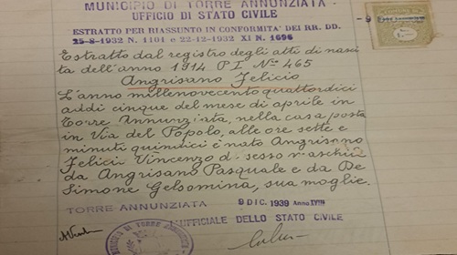 Felicio Angrisano nacque il 5 aprile 1914, alle ore sette e minuti quindici nella casa dei genitori in Via del Popolo. La madre, Gelsomina De Simone, era la moglie di Pasquale Angrisano. Per l'esattezza al neonato furono dati due nomi, oltre a Felicio anche quello di Vincenzo. Fu dichiarato al Comune da una donna, Francesca Tramontano, prima levatrice e poi corretta in casalinga, in quanto il padre non aveva potuto dichiararlo "per ragione delle sue occupazioni".