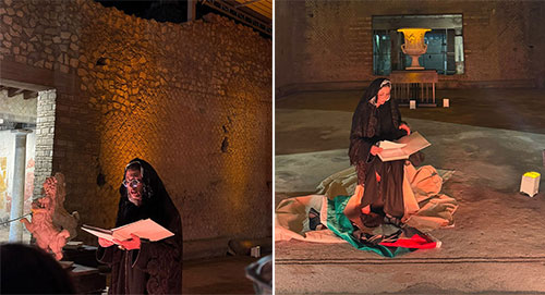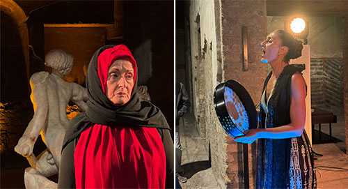 “Racconti di Donne e Madonne” è stato uno spettacolo immersivo, unico nel suo genere nella suggestiva e splendida cornice della Villa di Poppea. In scena Fiorenza Calogero, Sonia De Rosa, Federica di Lallo, Cristina Donadio, Teresa del Vecchio, Sabrina Efionayi, Flo e il coro polifonico Kore della Sirena, Marisa Laurito, Francesca Marini, Ida Palisi e Antonella Stefanucci, che si sono esibite contemporaneamente, ciascuna in un luogo diverso all’interno degli scavi, portando “in scena” in un ciclo continuo, brani tratti da libri, articoli, monologhi teatrali e canzoni.