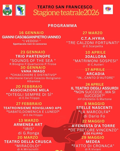 «Questa seconda edizione si caratterizza per l'attenzione al recupero della socialità da realizzare attraverso la creazione di laboratori teatrali, di lettura e scrittura creativa rivolti soprattutto ai giovani - sottolinea Liliana Peluso, direttrice artistica della rassegna – ma anche di scenografia in collaborazione con il mondo della scuola e dell'artigianato». Il ricchissimo programma prevede 15 appuntamenti, di cui 13 in concorso, con date fissate in prevalenza di venerdì perché la primissima rassegna qualche anno fa, con compagnie di professionisti, nacque come progetto “Venerdì in parrocchia”. Il palco del San Francesco ospiterà opere di Eduardo De Filippo, Raffaele Viviani, Eduardo Scarpetta, Dario Fo, ma anche di autori contemporanei di rilievo a conferma del notevole spessore artistico fatto registrare dalla rassegna fin dal suo esordio.