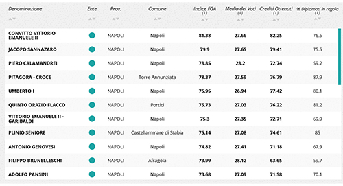 Di seguito il riquadro della classifica pubblicata da Eduscopio della fondazione Agnelli. Una graduatoria molto significativa nella quale si evince che i risultati universitari degli alunni del Liceo Classico “Pitagora-Croce” di Torre Annunziata sono superiori a quelli degli altri istituti del circondario e anche di alcuni omologhi napoletani.
