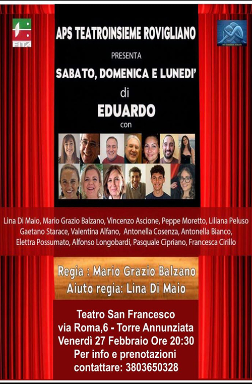 “Sabato, domenica e lunedì” è il secondo lavoro della Compagnia “Teatroinsieme Rovigliano”, sodalizio artistico torrese nato nel 2024, presieduto da Vincenzo Ascione e affiliato alla FITA (Federazione Italiana del Teatro e delle Arti). La commedia è stata già portata in scena al “Di Costanzo-Mattiello” di Pompei in doppia replica il 14 e 15 febbraio scorsi. Una rappresentazione di elevato spessore artistico grazie ad una tavolozza di colori sapientemente variegata con sfumature adeguate al racconto che è arrivato in platea nitido, terso assolutamente privo di sbavature. Merito di un cast di attori che ha metabolizzato la profondità dell’opera intersecandola con toni leggeri propedeutici a rendere gradevole la narrazione.