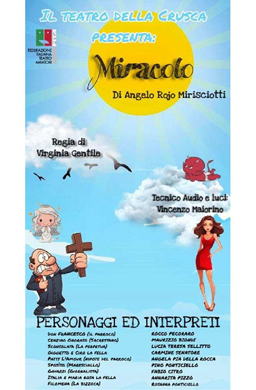 La compagnia “Il Teatro Della Crusca” di Baronissi (SA) porta in scena un lavoro di Angelo Rojo Mirisciotti, “Miracolo!”, commedia musicale in due atti, per la regia a cura di Virginia Gentile, dal 1998 guida artistica del team. L’associazione, alla sua prima partecipazione alla “Rassegna del Teatro Amatoriale Sanfrancesco”, ha al suo attivo numerosi successi mettendo in scena commedie di grandi autori quali Eduardo De Filippo, Scarpetta, Di Maio, Fayad, ma anche di Eva De Rosa e dell’eclettico Massimo Canzano. Nel 2008, nell’ambito della rassegna “Teatro mio Diletto” di Baronissi, si aggiudica il premio “miglior compagnia” e, nello stesso anno, conquista il riconoscimento miglior attrice non protagonista nella kermesse di Montecorvino Pugliano, “Teatro Festival”.