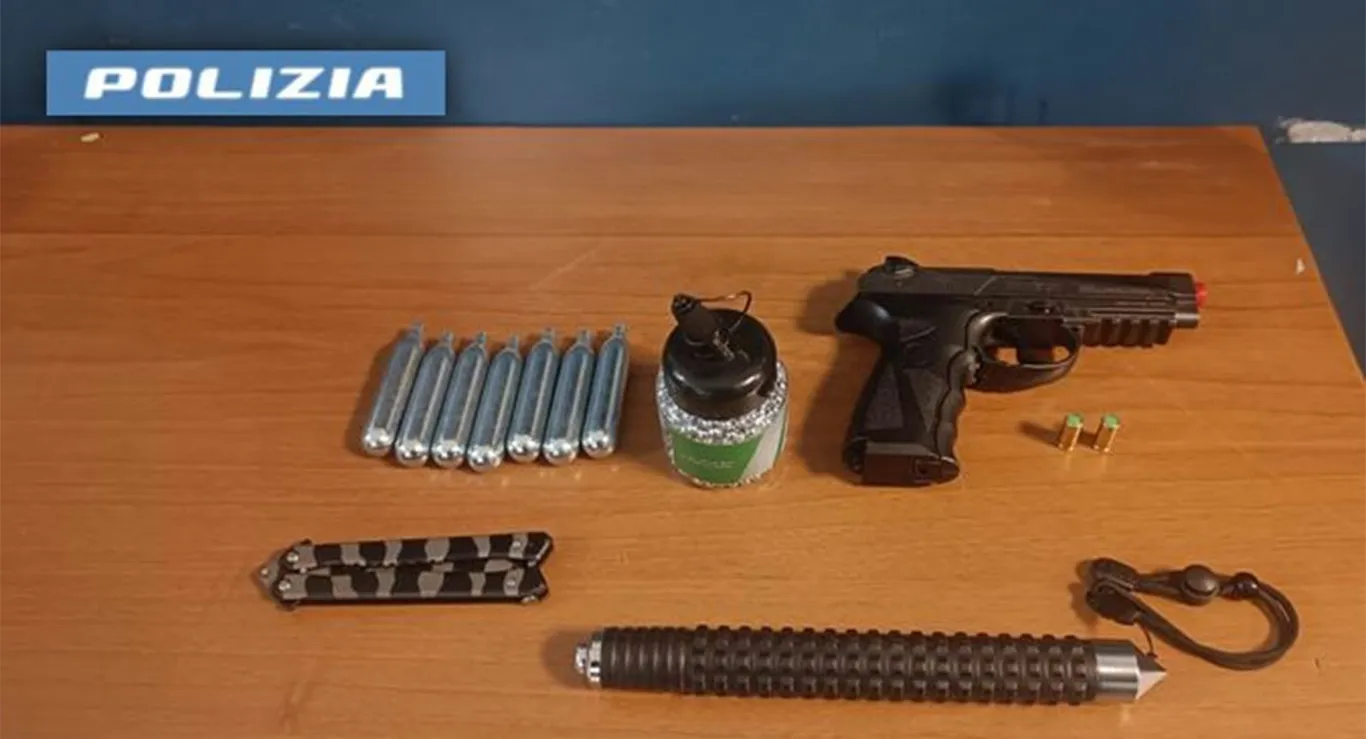 In seguito al controllo effettuato all'interno del veicolo, è stata trovata l'arma utilizzata per i raid, una pistola 'softair' munita di caricatore rifornito di 3 pallini di 6 millimetri, un barattolo con circa 900 pallini dello stesso calibro, 7 bombolette di anidride carbonica per consentire il funzionamento dell'arma, uno sfollagente telescopico in acciaio e due proiettili a salve. A seguito della perquisizione personale a carico del conducente, è stato inoltre trovato un coltello a farfalla, nascosto all'interno di un marsupio.