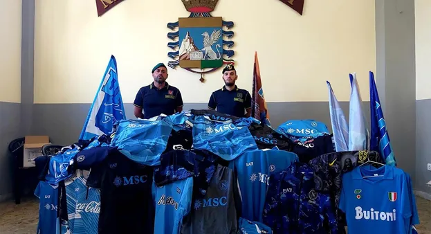 Tra il materiale sequestrato figurano maglie, sciarpe, pantaloncini, cappellini e altro merchandising riproducenti marchi ed effigi non autorizzati del Napoli Calcio e dei suoi calciatori, nonché bandiere e striscioni di incitamento alla squadra, per un valore commerciale stimato di oltre 300mila euro.