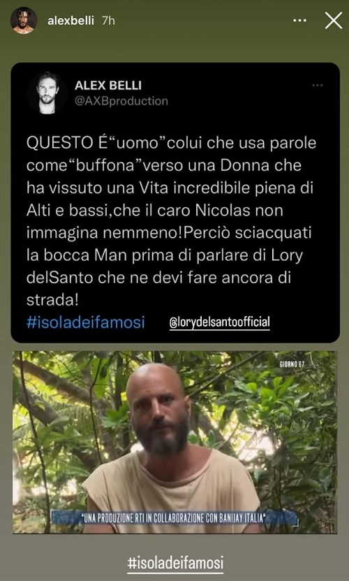 Ad infuocare ancora di più il clima ci ha pensato Alex Belli, che su Instagram ha condiviso una stories in cui si scaglia pesantemente contro Nicolas Vaporidis: “Questo è ‘uomo’, colui che usa parole come ‘buffona’ verso una donna che ha vissuto una vita incredibile piena di alti e bassi, che il caro Nicolas non immagina nemmeno. Perciò sciacquati la bocca prima di parlare di Lory Del Santo, che ne devi fare ancora di strada”.