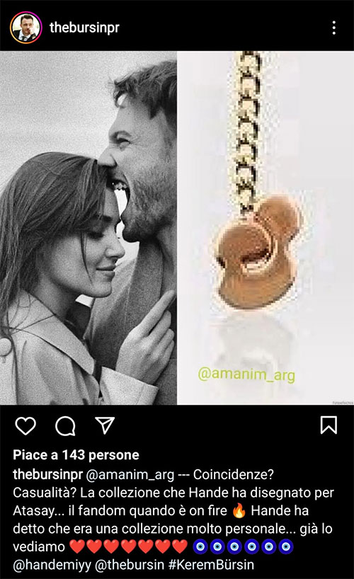 Sempre sui suoi account social, Hande ha pubblicato una sua creazione personale per Atasay Jewelry, la linea di gioielli di cui è testimonial. L’oggetto creato dalla Erçel rappresenta un abbraccio, ma a stupire è che sembrerebbe ispirato proprio ad una foto di Hande e Kerem.