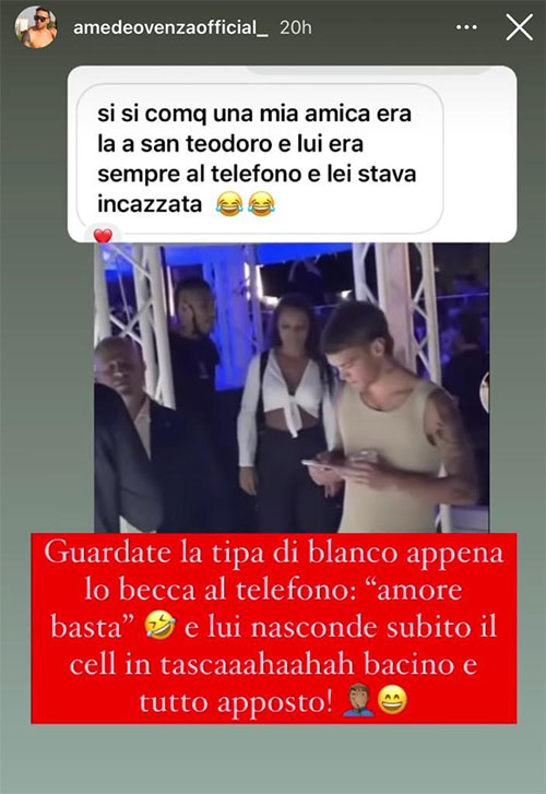 In questi giorni, la coppia si trova in vacanza in Sardegna. Ed è proprio a San Teodoro, nota località turistica dell’isola, che Blanco e Martina Valdes sono stati filmati (a loro insaputa) da una persona che era presente all’interno dello stesso locale in cui si trovavano i due. Nel breve filmato, che è stato condiviso su Instagram da Amedeo Venza, si vede il cantante “beccato” dalla Valdes mentre, presumibilmente, scrive un messaggio con il proprio smartphone. La ragazza, visibilmente infastidita, esclama “Amore, basta!”: Blanco mette subito il cellulare nella tasca dei pantaloni e le dà un bacio.