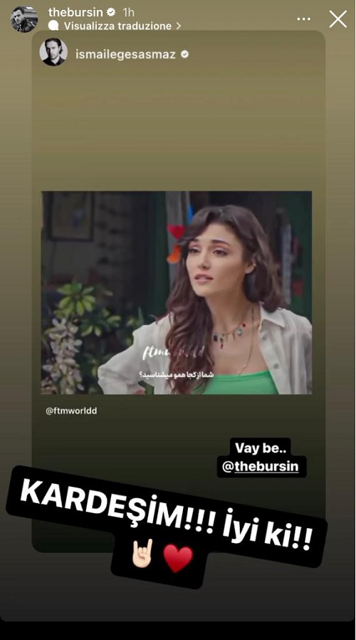 E ora, che succede tra Kerem e Hande? Nelle ultime ore, l’attore turco ha compiuto un significativo gesto social che ha mandato letteralmente in visibilio gli HanKer. In una Ig story, Bürsin ha condiviso un reel del suo amico İsmail Ege Şaşmaz, noto aver interpretato il ruolo di Kaan Karadağ nella fiction Love is in the air. Nella breve clip si vedono proprio alcune scene della serie tv in cui ci sono Kerem e Hande, con Şaşmaz che tagga Bürsin e gli scrive “Avanti”, e l’attore che risponde “Fratello, va bene così”.