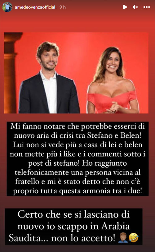Secondo l’influencer ed esperto di gossip, Amedeo Venza, infatti, potrebbe tirare nuovamente aria di crisi tra la showgirl argentina e il conduttore napoletano. “Mi fanno notare che potrebbe esserci di nuovo aria di crisi tra Stefano e Belen”, scrive Venza in una Ig story. “Lui non si vede più a casa di lei e Belén non mette più like e commenti sotto i post di Stefano. Ho raggiunto telefonicamente una persona vicina al fratello, e mi è stato detto che non c’è proprio tutta questa armonia tra i due”. Poi ironizza: “Certo che se si lasciano di nuovo in Arabia Saudita, non lo accetto!”.
